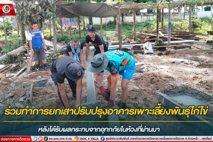 เมื่อวันที่ 10 มกราคม 2566 เวลา 10.00 น. ที่โรงเรียนตำรวจตระเวนชายแดนบ้านไอร์บือแต หมู่ที่ 4 ตำบลช้างเผือก อำเภอจะแนะ จังหวัดนราธิวาส หน่วยเฉพาะกิจกรมทหารพรานที่ 49 โดย ร้อยโท วัชรินทร์ ลีพิลา ผู้บังคับกองร้อยทหารพรานที่ 4910 จัดกำลังพลหัวหน้าชุดปฏิบัติการกองร้อยทหารพรานที่ 4910 พร้อมด้วยบุคลากรทางการศึกษา ร่วมทำการยกเสาปรับปรุงอาคารเพาะเลี้ยงพันธุ์ไก่ไข่ หลังได้รับผลกระทบจากอุทกภัยในห้วงที่ผ่านมา ทั้งนี้เพื่อบรรเทาความเดือดร้อนในทุกด้าน อีกทั้งเป็นการช่วยเหลือฟื้นฟูให้ประชาชนในพื้นที่กลับมาใช้ชีวิตอย่างปกติสุข