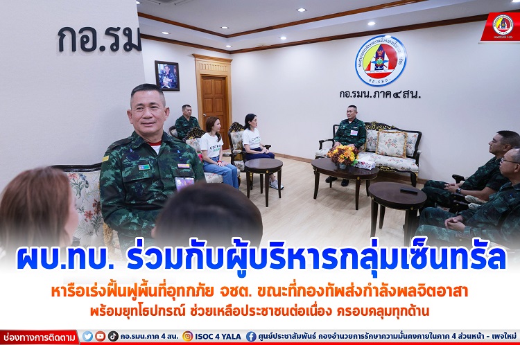 ขณะเดียวกัน พลโท ปราโมทย์ พรหมอินทร์ แม่ทัพน้อยที่ 4 / รองผู้อำนวยการรักษาความมั่นคงภายในภาค 4 ส่วนหน้า ร่วมให้การต้อนรับผู้บริหารกลุ่มเซ็นทรัล เพื่อหารือการช่วยเหลือผู้ประสบอุทกภัยด้วยความปรารถนาดี และความห่วงใยร่วมกัน