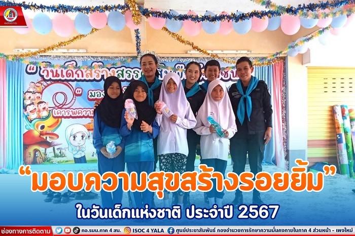 วันที่ 11 มกราคม 2567 ที่โรงเรียนบ้านโคก หมู่ที่ 5 ตำบลจวบ อำเภอเจาะไอร้อง จังหวัดนราธิวาส หน่วยเฉพาะกิจกรมทหารพรานที่ 48 โดยกองร้อยทหารพรานที่ 4802 พร้อมด้วยชุดปฏิบัติการกิจการพลเรือนหมวดทหารพรานหญิงที่ 48 ร่วมกิจกรรมงานวันเด็กแห่งชาติ ประจำปี 2567 ภายใต้คำขวัญ “มองโลกกว้าง คิดสร้างสรรค์ เคารพความแตกต่าง ร่วมกันสร้างประชาธิปไตย” โดยร่วมทำกิจกรรมนันทนาการ มอบของขวัญ มอบความสุขสนุกสนานให้กับเด็ก ๆ อีกทั้งยังเป็นการสร้างความสัมพันธ์อันดีระหว่างเจ้าหน้าที่ทหาร ครู และนักเรียน ซึ่งบรรยากาศเต็มไปด้วยรอยยิ้มและความสนุกสนานจากเด็กๆและประชาชนในพื้นที่