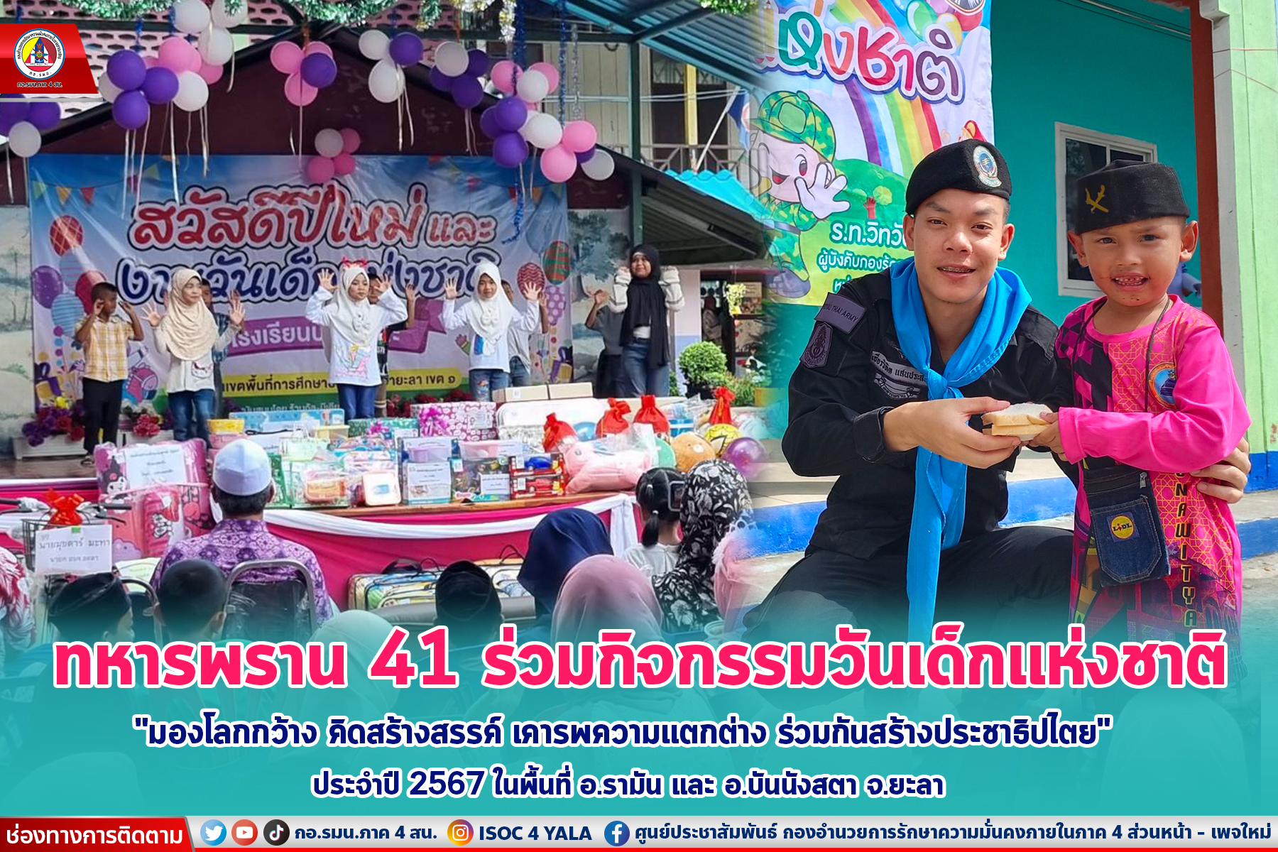 วันที่ 11 มกราคม 2567 ชุดปฏิบัติการกิจการพลเรือน กองร้อยทหารพรานหน่วยขึ้นตรง หน่วยเฉพาะกิจกรมทหารพรานที่ 41 พร้อมด้วย ชุดปฏิบัติการกิจการเรือน หมวดทหารพรานหญิง หน่วยเฉพาะกิจกรมทหารพรานที่ 41 ร่วมกับ บุคลากรทางการศึกษา, ผู้นำท้องที่, ผู้นำท้องถิ่น, ผู้ปกครอง และประชาชนในพื้นที่ ดำเนินการจัดกิจกรรมวันเด็กแห่งชาติ “มองโลกกว้าง คิดสร้างสรรค์ เคารพความแตกต่าง ร่วมกันสร้างประชาธิปไตย” ประจำปี 2567 รวมถึงปลูกฝังอุดมการณ์ความรักชาติ ศาสนา และสถาบันพระมหากษัตริย์ พร้อมสนับสนุนไอศกรีม ไอติมหลอดหวานเย็น และของรางวัลมอบให้กับเด็กภายในงาน เพื่อสร้างรอยยิ้มให้กับเด็กและเยาวชน ในพื้นที่ อำเภอรามัน และ อำเภอบันนังสตา จังหวัดยะลา