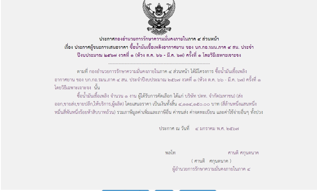 จัดซื้อ จัดจ้างประกาศผู้ชนะการเสนอราคา ประกาศผู้ชนะการเสนอราคา ซื้อน้ำมันเชื้อเพลิงอากาศยาน ของ บก.กอ.รมน.ภาค ๔ สน. ประปีงบประมาณ ๒๕๖๗ งวดที่ ๑ (ห้วง ต.ค.๖๖ – มี.ค.๖๗) ครั้งที่ ๑ โดยวิธีเฉพาะเจาะจง January 13, 2024 431 Share Facebook Twitter Google+ Telegram LINE