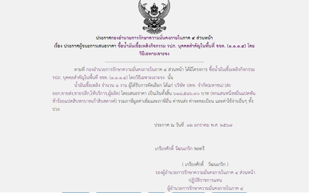 จัดซื้อ จัดจ้างประกาศผู้ชนะการเสนอราคา ประกาศผู้ชนะการเสนอราคา ซื้อน้ำมันเชื้อเพลิงกิจกรรม รปภ. บุคคลสำคัญในพื้นที่ จชต. (๑.๑.๑.๔) โดยวิธีเฉพาะเจาะจง January 13, 2024 300 Share Facebook Twitter Google+ Telegram LINE