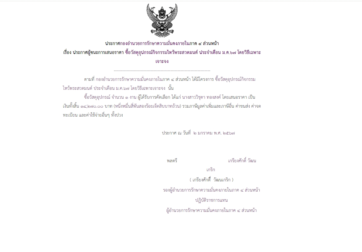ประกาศผู้ชนะการเสนอราคา ซื้อวัสดุอุปกรณ์กิจกรรมไหว้พระสวดมนต์ ประจำเดือน ม.ค.๖๗ โดยวิธีเฉพาะเจาะจง