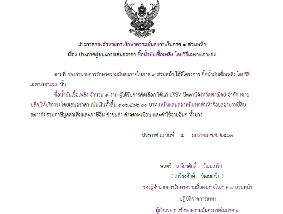 ประกาศผู้ชนะการเสนอราคา ซื้อน้ำมันเชื้อเพลิง โดยวิธีเฉพาะเจาะจง