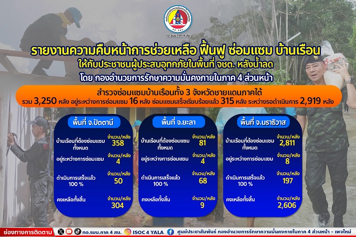 จากสถานการณ์อุทกภัยในพื้นที่จังหวัดชายแดนภาคใต้ ทั้งจังหวัดปัตตานี ยะลา นราธิวาส และบางส่วนของจังหวัดสงขลา ที่เกิดขึ้นเมื่อวันที่ 22 – 26 ธันวาคม 2566 ที่ผ่านมา กองอำนวยการรักษาความมั่นคงภายในภาค 4 ส่วนหน้า โดย พลโท ศานติ ศกุนตนาค แม่ทัพภาคที่ 4 / ผู้อำนวยการรักษาความมั่นคงภายในภาค 4 ได้บูรณาการกับหน่วยงานในพื้นที่เข้าดำเนินการช่วยเหลือ ฟื้นฟู ซ่อมแซมบ้านเรือนให้แก่ประชาชนผู้ได้รับผลกระทบโดยทันที