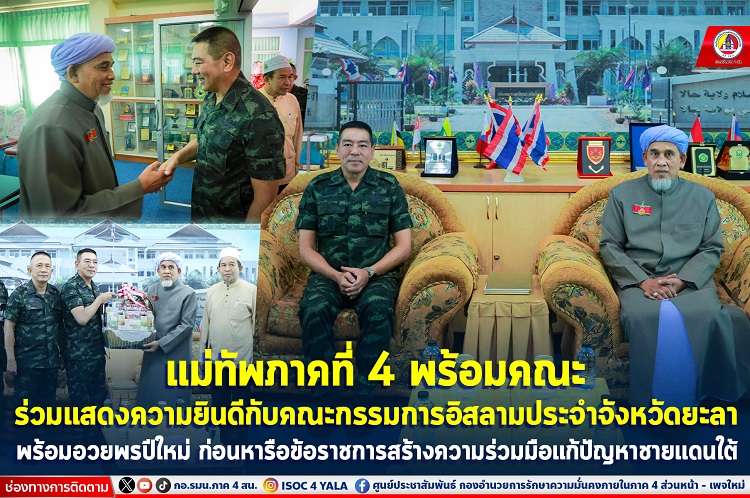 ด้าน นายอับดุลบาซิ เจ๊ะมะ ประธานคณะกรรมการอิสลามประจำจังหวัดยะลา ได้กล่าวขอบคุณ แม่ทัพภาคที่ 4 และคณะทำงานด้านความมั่นคง ที่ได้เดินทางมาเยี่ยมเยียน และพบปะพูดคุย รวมทั้งนำของขวัญปีใหม่มามอบให้กับกรรมการอิสลามจังหวัดยะลา โดยได้กล่าวชื่นชมการทำงานในการแก้ไขปัญหาพื้นที่จังหวัดชายแดนภาคใต้ในห้วงที่ผ่านมา สิ่งไหนที่เป็นความต้องการของพี่น้องประชาชนและนำความสงบสุขมาสู่พื้นที่ก็พร้อมให้ความร่วมมืออย่างเต็มที่ ทั้งนี้ได้ร่วมกันขอพรจากพระผู้เป็นเจ้า ขอให้การทำงานการแก้ไขปัญหาพื้นที่จังหวัดชายแดนภาคใต้ราบรื่น และประสบความสำเร็จนำความสันติสุขกลับมายังพื้นที่จังหวัดชายแดนภาคใต้อย่างยั่งยืนอีกด้วย