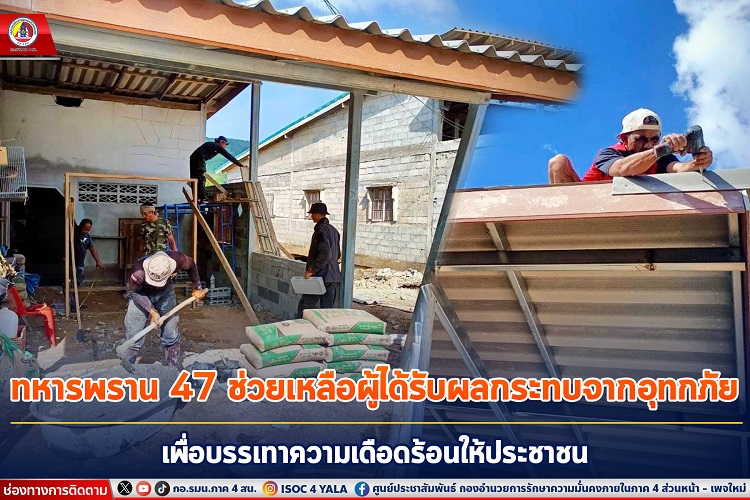 เมื่อวันที่ 14 มกราคม 2567 หน่วยเฉพาะกิจกรมทหารพรานที่ 47 จัดกำลังพล “ชุดปฏิบัติการเสริมสร้างความเข้าใจ” ของหน่วย ร่วมกับ ผู้นำชุมชน อาสารักษาดินแดนอำเภอกรงปินัง, สถานีตำรวจภูธรกรงปินัง และประชาชนในพื้นที่อำเภอกรงปินัง ร่วมกันดำเนินการซ่อมแซมบ้านพักอาศัยที่ได้รับความเสียหายจากอุทกภัยในห้วงที่ผ่านมา เพื่อเป็นการช่วยเหลือและบรรเทาความเดือดร้อนให้กับประชาชนในพื้นที่ อำเภอกรงปินัง จังหวัดยะลา