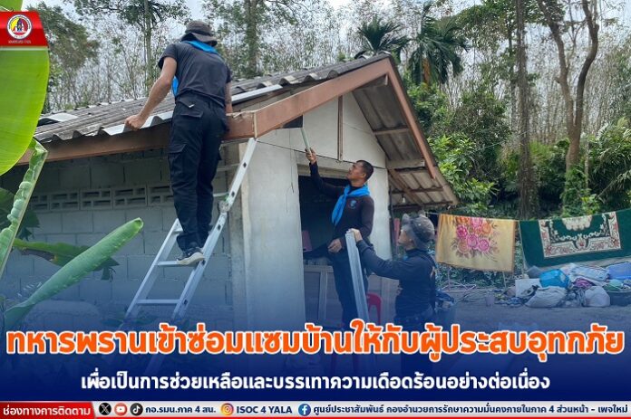 วันที่ 15 มกราคม 2567 ชุดปฏิบัติการกิจการพลเรือน กองร้อยทหารพรานหน่วยขึ้นตรง หน่วยเฉพาะกิจกรมทหารพรานที่ 41 ดำเนินการเข้าซ่อมแซมบ้านพักอาศัย ให้กับผู้ประสบอุทกภัยในห้วงที่ผ่านมา เพื่อเป็นการช่วยเหลือและบรรเทาความเดือดร้อนให้กับพี่น้องประชาชน จำนวน 3 ครอบครัว ในพื้นที่ อำเภอรามัน จังหวัดยะลา ประกอบด้วย ครอบครัวของ นายสาแมง ดอแม บ้านเลขที่ 329 หมู่ที่ 3 บ้านสะเตเซ็ง ตำบลบาลอ อำเภอรามัน จังหวัดยะลา , ครอบครัวของ นางสาวรอบ๊ะ บะโหะวา บ้านเลขที่ 83/1 หมู่ที่ 7 บ้านฮูแตบาโงย ตำบลเกะรอ อำเภอรามัน จังหวัดยะลา และครอบครัวของ นางสาวรอมือเลาะ สิมะยอ บ้านเลขที่ 10/1 หมู่ที่ 5 บ้าน สโต ตำบลอาซ่อง อำเภอรามัน จังหวัดยะลา
