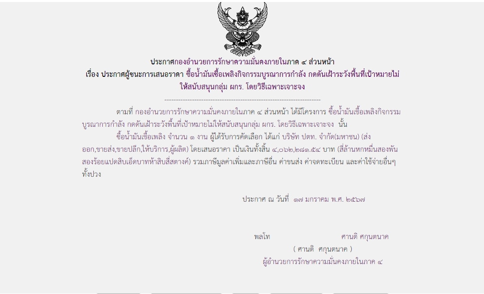 จัดซื้อ จัดจ้างประกาศผู้ชนะการเสนอราคา ประกาศผู้ชนะการเสนอราคา ซื้อน้ำมันเชื้อเพลิงกิจกรรมบูรณาการกำลัง กดดันเฝ้าระวังพื้นที่เป้าหมายไม่ให้สนับสนุนกลุ่ม ผกร. โดยวิธีเฉพาะเจาะจง January 17, 2024 445 Share Facebook Twitter Google+ Telegram LINE