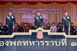 โอกาสนี้ พลตรี ไพศาล หนูสังข์ รองแม่ทัพภาคที่ 4 / รองผู้อำนวยการรักษาความมั่นคงภายในภาค 4 ส่วนหน้า ได้นำทหาร กล่าวคำสัตย์ปฏิญาณตนต่อธงชัยเฉลิมพล เนื่องในวันกองทัพไทย และวันกองทัพบก ประจำปีพุทธศักราช 2567 และได้อ่านสาส์น โอวาทของ พลเอก ทรงวิทย์ หนุนภักดี ผู้บัญชาการทหารสูงสุด ในโอกาสวันกองทัพไทย ประจำปี 2567 ว่า วันกองทัพไทย ตรงกับวันที่ 18 มกราคม ของทุกปีเป็นวันสำคัญยิ่งวันหนึ่งในประวัติศาสตร์ชาติไทย เป็นวันที่สมเด็จพระนเรศวรมหาราชทรงนำเหล่าทหารกล้าประกอบมหาวีรกรรมอันกล้าหาญในการปกป้องรักษาเอกราชอธิปไตย นับว่าเป็นเหตุการณ์ อันสำคัญยิ่งเป็นวันแห่งเกียรติยศและความภาคภูมิใจของคนไทยทั้งชาติที่ได้ระลึกถึงเหล่าบรรพชนไทยที่สละชีวิตและเลือดเนื้อ เป็นชาติพลี เพื่อความอยู่รอด และความมั่นคงปลอดภัยของบ้านเมืองอย่างยั่งยืนมาจนถึงปัจจุบันอันเป็นแบบอย่างที่เราเหล่าทหารทั้งหลายควรจักยึดถือ สืบทอดเจตนารมณ์ดังกล่าวสืบไป ตลอดระยะเวลาที่ผ่านมา กองทัพไทยมีหน้าที่พิทักษ์ปกป้องรักษา ชาติ ศาสนา และพระมหากษัตริย์ ช่วยเหลือประชาชนพัฒนาและแก้ไขปัญหาชองชาติ เพื่อให้ประชาชนอยู่อย่างร่มเย็นเป็นสุข ขอให้เพื่อนทหารทุกนาย มีความภาคภูมิใจในการปฏิบัติหน้าที่ ปฏิบัติงานด้วยความอดทนเสียสละ เห็นแก่ประโยชน์ส่วนรวมสนับสนุนภารกิจของรัฐบาลในการพัฒนาและแก้ไขปัญหาของชาติ จนเป็นที่เชื่อมั่นศรัทธาของประชาชนและขอให้เพื่อนทหารทุกท่านดำรงรักษาความดีนี้ไว้สืบไป