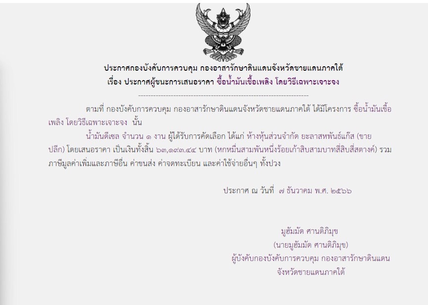 ประกาศผู้ชนะการเสนอราคา ซื้อน้ำมันเชื้อเพลิง โดยวิธีเฉพาะเจาะจง