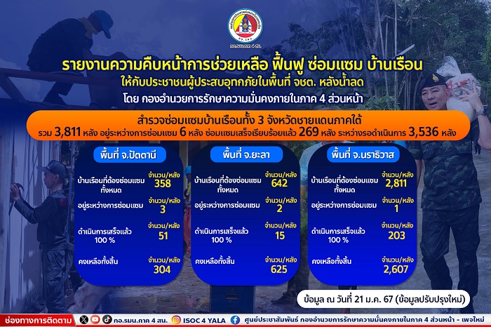 จากสถานการณ์อุทกภัยในพื้นที่จังหวัดชายแดนภาคใต้ ทั้งจังหวัดปัตตานี ยะลา นราธิวาส และบางส่วนของจังหวัดสงขลา ที่เกิดขึ้นเมื่อวันที่ 22 – 26 ธันวาคม 2566 ที่ผ่านมา กองอำนวยการรักษาความมั่นคงภายในภาค 4 ส่วนหน้า โดย พลโท ศานติ ศกุนตนาค แม่ทัพภาคที่ 4 / ผู้อำนวยการรักษาความมั่นคงภายในภาค 4 ได้บูรณาการกับหน่วยงานในพื้นที่เข้าดำเนินการช่วยเหลือ ฟื้นฟู ซ่อมแซมบ้านเรือนให้แก่ประชาชนผู้ได้รับผลกระทบโดยทันที