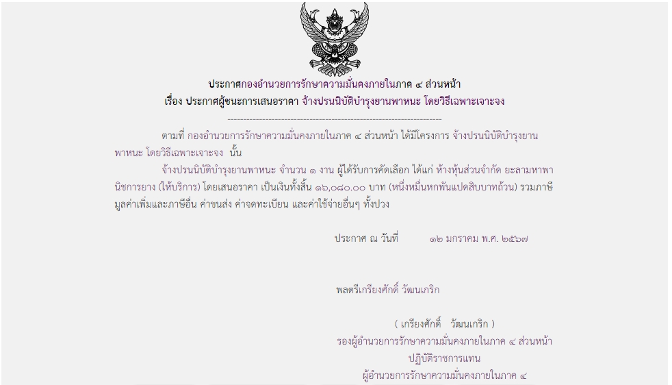 ประกาศผู้ชนะการเสนอราคา จ้างปรนนิบัติบำรุงยานพาหนะ โดยวิธีเฉพาะเจาะจง
