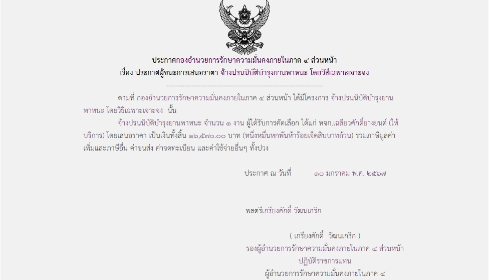 ประกาศผู้ชนะการเสนอราคา จ้างปรนนิบัติบำรุงยานพาหนะ โดยวิธีเฉพาะเจาะจง