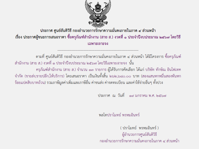 จัดซื้อ จัดจ้างประกาศผู้ชนะการเสนอราคา ประกาศผู้ชนะการเสนอราคา ซื้อครุภัณฑ์สำนักงาน (สาย ส.) งวดที่ ๑ ประจำปีงบประมาณ ๒๕๖๗ โดยวิธี เฉพาะเจาะจง January 22, 2024 476 Share Facebook Twitter Google+ Telegram LINE