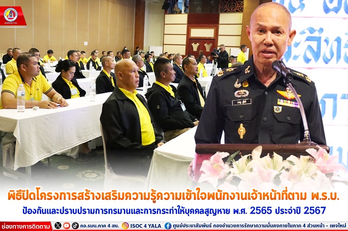 เมื่อวันนี้ ( 24 มกราคม 2567 ) เวลา 11.30 น. ณ โรงแรมบีพี สมิหลา บีช โฮเทล แอนด์ รีสอร์ท อำเภอเมือง จังหวัดสงขลา พลตรี กรกฎ ภู่โชติ รองผู้อำนวยการรักษาความมั่นคงภายในภาค 4 ส่วนหน้า เป็นประธานในพิธีปิดโครงการสร้างเสริมความรู้ความเข้าใจพระราชบัญญัติป้องกันและปราบปรามการทรมานและการกระทำให้บุคคลสูญหาย พ.ศ.2565 ให้กับพนักงานเจ้าหน้าที่ที่ปฏิบัติงานในพื้นที่จังหวัดชายแดนภาคใต้ และ 4 อำเภอของจังหวัดสงขลา เพื่อสร้างความรู้ความเข้าใจเนื้อหา ของพระราชบัญญัติป้องกันและปราบปรามการทรมานและการกระทำให้บุคคลสูญหาย พ.ศ. 2565 นำความรู้ที่ได้รับไปปฏิบัติได้อย่างถูกต้อง และขยายผลให้การปฎิบัติของหน่วยงานในภาพรวมเป็นไปตามบทบัญญัติของกฎหมาย โดยมีเจ้าหน้าที่ในโครงสร้างกองอำนวยการรักษาความมั่นคงภายในภาค 4 ส่วนหน้า จำนวน 150 นาย จัดขึ้นตั้งแต่วันที่ 22 – 24 มกราคม 2567