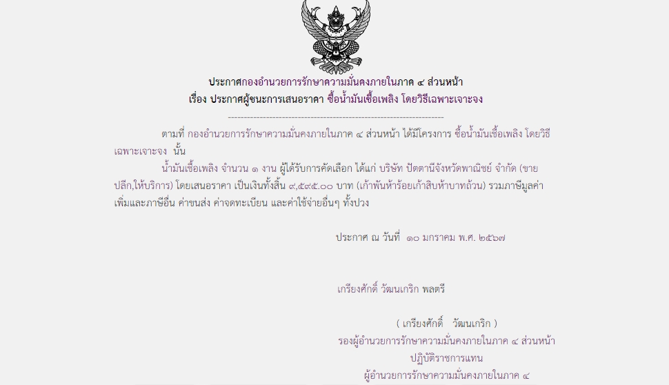 ประกาศผู้ชนะการเสนอราคา ซื้อน้ำมันเชื้อเพลิง โดยวิธีเฉพาะเจาะจง