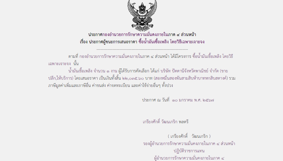 ประกาศผู้ชนะการเสนอราคา ซื้อน้ำมันเชื้อเพลิง โดยวิธีเฉพาะเจาะจง