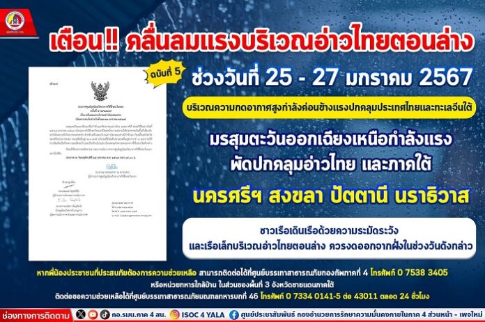 เตือน!! คลื่นลมแรงบริเวณอ่าวไทยตอนล่าง ช่วงวันที่ 25 – 27 มกราคม 2567 ฉบับที่ 5 บริเวณความกดอากาศสูงกำลังค่อนข้างแรงปกคลุมประเทศไทยและทะเลจีนใต้ มรสุมตะวันออกเฉียงเหนือกำลังแรงพัดปกคลุมอ่าวไทย และภาคใต้ นครศรีฯ สงขลา ปัตตานี นราธิวาส