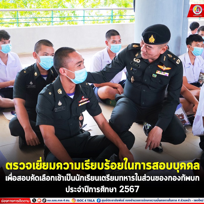 วันนี้ 27 มกราคม 2567 เวลา 11.00 น. ณ กองอำนวยการสอบนักเรียนเตรียมทหาร กองทัพบก จังหวัดสุราษฎร์ธานี โดยมณฑลทหารบกที่ 45 ณ มหาวิทยาลัยราชภัฏสุราษฎร์ธานี พลโท ศานติ ศกุนตนาค แม่ทัพภาคที่ 4/ ผู้อำนวยการรักษาความมั่นคงภายในภาค 4 ลงพื้นที่ตรวจเยี่ยมความเรียบร้อยในการสอบบุคคลเพื่อสอบคัดเลือกเข้าเป็นนักเรียนเตรียมทหารในส่วนของกองทัพบก ประจำปีการศึกษา 2567 พร้อมเน้นย้ำคณะกรรมการปฏิบัติหน้าที่ด้วยความโปร่งใส บริสุทธิ์ ยุติธรรม ทั้งนี้ แม่ทัพภาคที่ 4 ได้พบปะ พูดคุยให้กำลังใจ น้องๆ ที่เข้ารับการทดสอบ ตลอดจนครอบครัวที่มาคอยให้กำลังใจ ถึงสิ่งสำคัญในการสอบ คือการสร้างแรงบันดาลใจในตนเอง ก่อนเน้นย้ำถึงความเชื่อมั่นในกติกาหลักเกณฑ์ความบริสุทธิ์ยุติธรรม ที่น้องๆ และผู้ปกครองที่คอยมาให้กำลังใจจากกองทัพบก ซึ่งในวันนี้มีผู้สมัคร และผู้มีสิทธิ์สอบจำนวน 360 คน โดยรวมยอดผู้มีสิทธิ์สอบในพื้นที่พิเศษ และบุตรกำลังพลของกองทัพบก