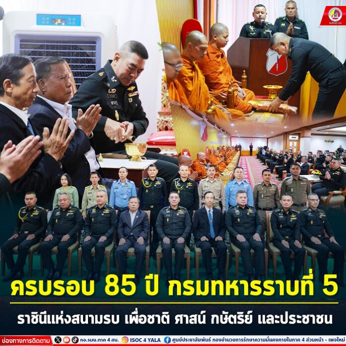 วันนี้ 28 มกราคม 2567 เวลา 10.00 ณ กองบังคับการกรมทหารราบที่ 5 ค่ายเสนาณรงค์ อำเภอหาดใหญ่ จังหวัดสงขลา พลโท ศานติ ศกุนตนาค แม่ทัพภาคที่ 4 เป็นประธานในพิธีทำบุญเนื่องในงานวันสถาปนากรมทหารราบที่ 5 ครบรอบปีที่ 85 จัดขึ้นเพื่ออุทิศบุญกุศล และระลึกถึงคุณงามความดีของกำลังพลที่ได้เสียสละทั้งชีวิตในการปกป้องอธิปไตยของชาติ ตลอดจนเพื่อความเป็นสิริมงคลแก่หน่วย และเป็นขวัญกำลังใจแก่กำลังพล ทั้งนี้ ได้จัดให้มีพิธีทางศาสนา ถวายภัตตาหารเพลแก่พระสงฆ์ ตลอดจนมอบโล่ประกาศเกียรติคุณให้กับกำลังพลดีเด่นของกรมทหารราบที่ 5 และมอบทุนการศึกษาให้บุตรของกำลังพลกรมทหารราบที่ 5 โดยมี พลตรี ปกรณ์ จันทรโชตะ ผู้บัญชาการมณฑลทหารบกที่ 42, พลตรี อภินันท์ แจ่มแจ้ง ผู้บัญชาการกองพลทหารราบที่ 5, พันเอก ทวีพร คณะทอง ผู้บังคับการกรมทหารราบที่ 5, ประธานสมาคมแม่บ้านทหารบก สาขากรมทหารราบที่ 5, ผู้บังคับหน่วยขึ้นตรง, อดีตผู้บังคับบัญชา, ข้าราชการ, ทหาร, ตำรวจ ร่วมพิธีอย่างพร้อมเพรียง