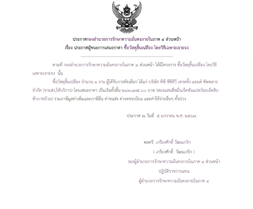 ประกาศผู้ชนะการเสนอราคา ซื้อวัสดุสิ้นเปลือง โดยวิธีเฉพาะเจาะจง