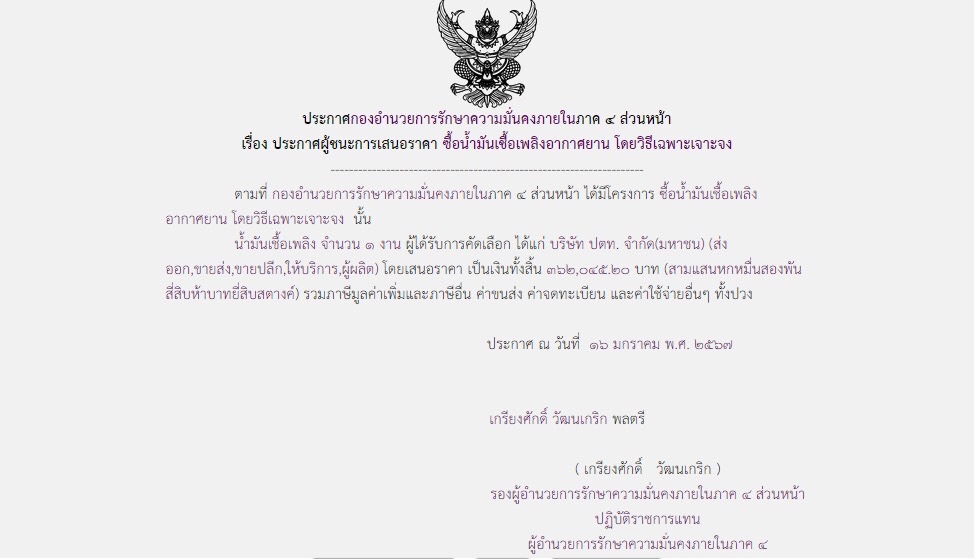 ประกาศผู้ชนะการเสนอราคา ซื้อน้ำมันเชื้อเพลิงอากาศยาน โดยวิธีเฉพาะเจาะจง