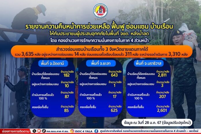 จากสถานการณ์อุทกภัยในพื้นที่จังหวัดชายแดนภาคใต้ ทั้งจังหวัดปัตตานี ยะลา นราธิวาส และบางส่วนของจังหวัดสงขลา ที่เกิดขึ้นเมื่อวันที่ 22 – 26 ธันวาคม 2566 ที่ผ่านมา กองอำนวยการรักษาความมั่นคงภายในภาค 4 ส่วนหน้า โดย พลโท ศานติ ศกุนตนาค แม่ทัพภาคที่ 4 / ผู้อำนวยการรักษาความมั่นคงภายในภาค 4 ได้บูรณาการกับหน่วยงานในพื้นที่เข้าดำเนินการช่วยเหลือ ฟื้นฟู ซ่อมแซมบ้านเรือนให้แก่ประชาชนผู้ได้รับผลกระทบโดยทันที