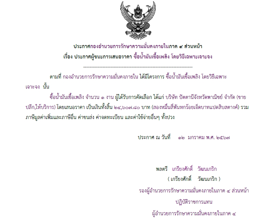 ประกาศผู้ชนะการเสนอราคา ซื้อน้ำมันเชื้อเพลิง โดยวิธีเฉพาะเจาะจง