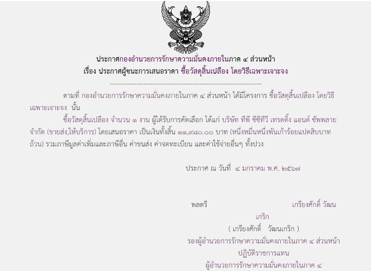 ประกาศผู้ชนะการเสนอราคา ซื้อวัสดุสิ้นเปลือง โดยวิธีเฉพาะเจาะจง