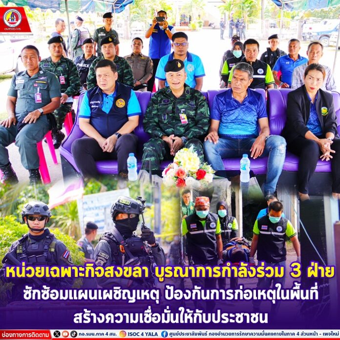เมื่อวันที่ 31 มกราคม 2567 เวลา 14.30 น. ที่ ฐานปฏิบัติการ ชุดคุ้มครองตำบลนาหมอศรี อำเภอนาทวี จังหวัดสงขลา พันเอก ปัญญาพล สุรทิณฑ์ เสนาธิการหน่วยเฉพาะกิจสงขลา ร่วมสังเกตุการณ์ การซักซ้อมแผนเผชิญเหตุ ป้องกันการก่อเหตุในพื้นที่ อำเภอนาทวี จังหวัดสงขลา ประจำเดือน มกราคม 2567 โดยจำลองเหตุการณ์กรณีกลุ่มผู้ก่อเหตุรุนแรง ได้ขว้างระเบิดแสวงเครื่องชนิดไปบ์บอมบ์ใส่ป้อมเวรยามรักษาการณ์ พร้อมทั้งนำวัตถุระเบิดแสวงเครื่องไปวางไว้บริเวณหน้าฐานปฏิบัติการ ชุดคุ้มครองตำบลนาหมอศรี ทั้งนี้เพื่อให้เกิดการประสานสอดคล้องกับหน่วยกำลังในพื้นที่ ในการควบคุมพื้นที่ การกั้นที่เกิดเหตุ และการส่งกลับสายแพทย์ อีกทั้งให้เจ้าหน้าที่ได้เข้าใจถึงขั้นตอนต่าง ๆ รวมทั้งสามารถปฏิบัติตามได้อย่างถูกต้องแบบทันท่วงที และปลอดภัย พร้อมสร้างความเชื่อมั่นให้กับประชาชนในพื้นที่