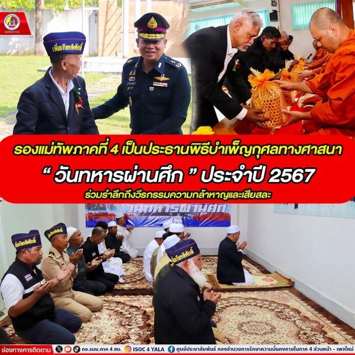 วันนี้ (3 กุมภาพันธ์ 2567) เวลา 10.00 น. ณ ห้องประชุม สำนักงานสงเคราะห์ทหารผ่านศึก เขตปัตตานี ตำบลบานา อำเภอเมือง จังหวัดปัตตานี พลตรี ไพศาล หนูสังข์ รองแม่ทัพภาคที่ 4 / รองผู้อำนวยการรักษาความมั่นคงภายในภาค 4 ส่วนหน้า เป็นประธานในพิธีบำเพ็ญกุศลทางศาสนา เนื่องในวันทหารผ่านศึก ประจำปี 2567 เพื่อรำลึกถึงวีรชนผู้กล้าหาญที่ได้ประกอบคุณงามความดี โดยยอมเสียสละเลือดเนื้อและชีวิตเพื่อรักษาเอกราชและอธิปไตยของชาติในอดีต รวมทั้งอุทิศส่วนกุศลให้แก่ดวงวิญญาณของทหารผ่านศึกที่ล่วงลับไปแล้ว โดยมี พลตรี ขจรศักดิ์ อินทร์ทอง ผู้บัญชาการมณฑลทหารบกที่ 46, พลตรี เฉลิมพร ขำเขียว ผู้บัญชาการกองพลทหารราบที่ 15, ผู้บังคับบัญชา, ข้าราชการ, ทหารผ่านศึกและผู้นำศาสนาเข้าร่วมในพิธีฯ