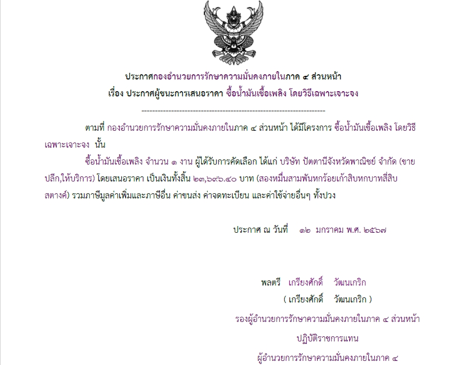 ประกาศผู้ชนะการเสนอราคา ซื้อน้ำมันเชื้อเพลิง โดยวิธีเฉพาะเจาะจง