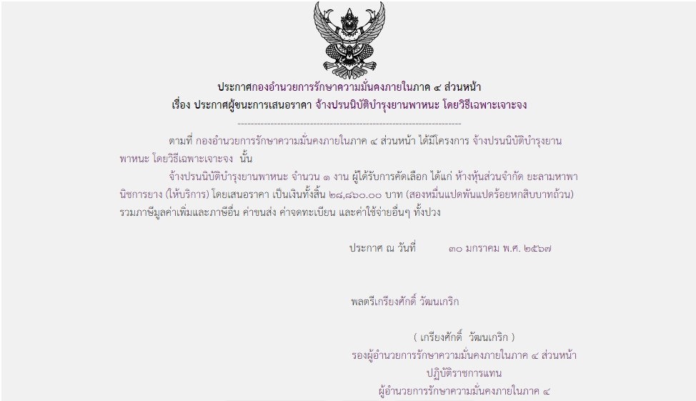 จัดซื้อ จัดจ้างประกาศผู้ชนะการเสนอราคา ประกาศผู้ชนะการเสนอราคา จ้างปรนนิบัติบำรุงยานพาหนะ โดยวิธีเฉพาะเจาะจง February 4, 2024 292 Share Facebook Twitter Google+ Telegram LINE