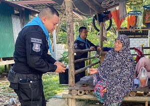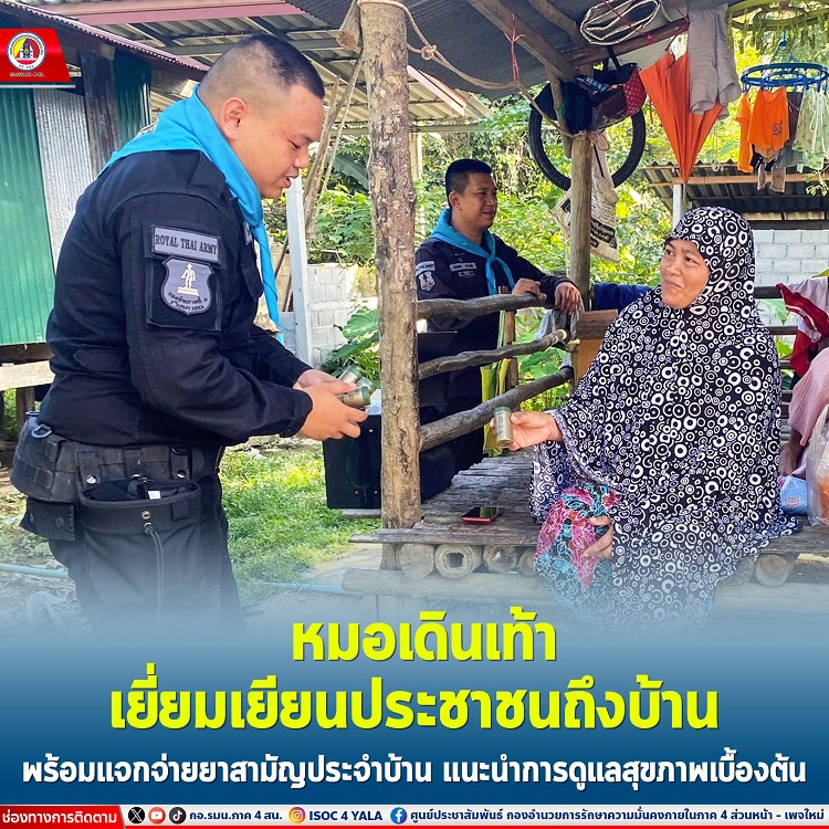 หน่วยเฉพาะกิจกรมทหารพรานที่ 33 จัดกำลังพล กองร้อยทหารพรานที่ 3305 และชุดหมอเดินเท้า ลงพื้นที่บ้านเขาน้ำตก หมู่ที่ 7 ตำบลตลิ่งชัน อำเภอบันนังสตา จังหวัดยะลา เพื่อพบปะ เยี่ยมเยียนสอบถามสารทุกข์สุขดิบของประชาชนในพื้นที่ พร้อมแจกจ่ายยาสามัญประจำบ้าน และให้คำแนะนำในการดูแลสุขภาพเบื้องต้นให้กับประชาชน