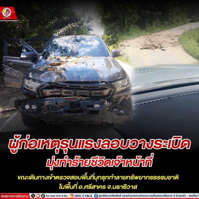 วันนี้ 4 กุมภาพันธ์ 2567 เวลา 11.30 น. กลุ่มผู้ก่อเหตุรุนแรงลอบวางระเบิด มุ่งทำร้ายชีวิต เจ้าหน้าที่หน่วยป้องกันรักษาป่าที่ 1 สาขานราธิวาส (ศรีสาคร) และเจ้าหน้าที่กองอำนวยการรักษาความมั่นคงภายในจังหวัดนราธิวาส จำนวน 4 นาย ในพื้นที่อำเภอศรีสาคร จังหวัดนราธิวาส ขณะเจ้าหน้าที่เดินทางเข้าไปทำการตรวจสอบพื้นที่การบุกรุกทำลายทรัพยากรธรรมชาติและสิ่งแวดล้อม เมื่อมาถึงบริเวณที่เกิดเหตุ บนถนนสายชนบท บ้านลูโบ๊ะยือริง (บ้านย่อยบ้านไอร์กือเน๊าะ) หมู่ที่ 5 ตำบลศรีบรรพต อำเภอศรีสาคร จังหวัดนราธิวาส ผู้ก่อเหตุรุนแรงได้จุดชนวนระเบิดแบบแสวงเครื่องที่ฝังไว้ใต้พื้นผิวถนน แรงระเบิดทำให้รถยนต์กระบะ ยี่ห้อ ฟอร์ด เรนเจอร์ สีดำ ได้รับความเสียหาย และเจ้าหน้าที่ได้รับบาดเจ็บ จำนวน 4 นาย ปัจจุบันถูกนำตัวส่งเข้ารับการรักษา ณ โรงพยาบาลศรีสาคร อำเภอศรีสาคร จังหวัดนราธิวาส ทราบชื่อ ดังนี้