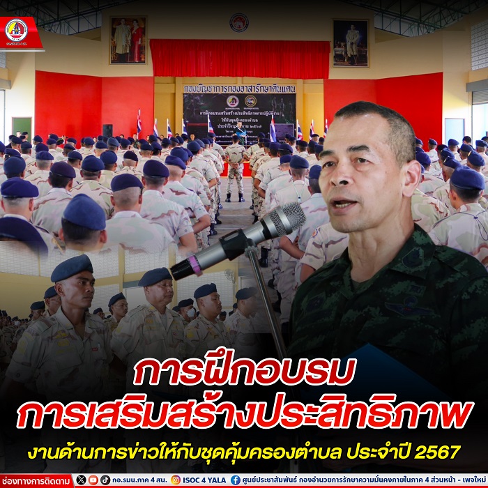 วันที่ 5 กุมภาพันธ์ 2567 เวลา 13.00 น. ที่ หอประชุม 1 ศูนย์ฝึกอบรมกองกำลังประจำถิ่นท่าสาป อำเภอเมือง จังหวัดยะลา พลตรี วัชรวิชย์ ณรงค์พันธุ์ รองผู้อำนวยการสำนักอำนวยการข่าวกรอง กองอำนวยการรักษาความมั่นคงภายในภาค 4 ส่วนหน้า เป็นประธานเปิดการฝึกอบรมการเสริมสร้างประสิทธิภาพงานด้านการข่าวให้กับชุดคุ้มครองตำบล ประจำปีงบประมาณ 2567 โดยมี พันเอก อนุชา โนนคู่เขตโขง รองเลขาธิการกองอำนวยการรักษาความมั่นคงภายในภาค 4 ส่วนหน้า นายหมวดเอก ธรอธิป อัครศรีกร เลขาธิการ กองบังคับการควบคุม กองอาสารักษาดินแดนจังหวัดชายแดนภาคใต้ คณะผู้บังคับบัญชา ตลอดจนสมาชิกกองอาสารักษาดินแดนที่ปฏิบัติหน้าที่ประจำชุดคุ้มครองตำบลในพื้นที่จังหวัดปัตตานี เข้าร่วม