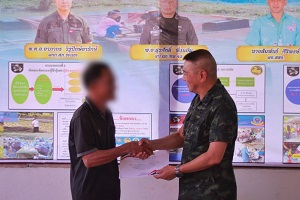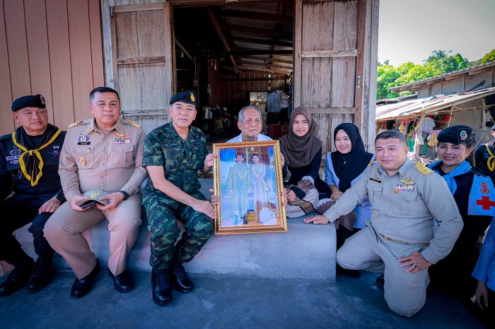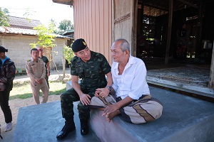 จากนั้น พลโท ศานติ ศกุนตนาค และคณะฯ ลงพื้นที่ชุมชนฮาปา ตำบลมะรือโบตก อำเภอระแงะ จังหวัดนราธิวาส เพื่อส่งมอบบ้านให้แก่ นาย มะ มะเซ็ง อายุ 73 ปี เป็นผู้ป่วยติดเตียง ซึ่ง เป็นผู้ยากไร้และเป็นผู้ประสบอุทกภัยน้ำท่วมที่ผ่านมา โดยหน่วยเฉพาะกิจกรมทหารพรานที่ 45 ได้จัดกำลังพลจิตอาสาพร้อมยุทธกรอุปกรณ์ เข้าดำเนินการซ่อมแซมปรับระเบียง และบันไดหน้าบ้าน ที่ชำรุดเสียหายจากอุทกภัยที่เกิดขึ้น ด้าน นางสาว นาอีหมะ มะเซ็ง บุตรีของ นาย มะฯ ได้ กล่าวขอบคุณด้วยรอยยิ้ม ที่หน่วยทหารไม่ทอดทิ้ง ให้ความสำคัญเร่งให้ความช่วยเหลือตั้งแต่เกิดเหตุ ระหว่างเกิดเหตุ และช่วยซ่อมแซมบ้านหลังดังกล่าวให้แก่ครอบครัวมะเซ็ง ยืน จะปฎิบัติหน้าที่เป็นลูกที่ดีและตั้งใจศึกษาเล่าเรียน เพื่อให้เป็นผู้มีความรู้ มีความสามารถ ได้ดูแลครอบครัวให้มีความอยู่ดี กินดี และนำความรู้มาส่งเสริม และพัฒนาชุมชนต่อไป