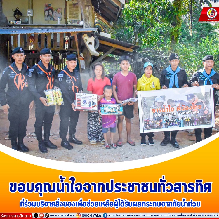 หน่วยเฉพาะกิจกรมทหารพรานที่ 46 โดย พันเอก สิทธิชัย บำรุงเขต ผู้บังคับหน่วยเฉพาะกิจกรมทหารพรานที่ 46 และกำลังพลทุกคน ขอขอบคุณน้ำใจจากพี่น้องประชาชนทั่วสารทิศ ได้หลังไหลร่วมบริจาคสิ่งของ เสื้อผ้าและของใช้ รวมถึงยารักษาโรค ฯลฯ จำนวนมากเพื่อช่วยพี่น้องผู้ประสบภัยน้ำท่วมในครั้งนี้ จนหน่วย สามารถช่วยเหลือและบรรเทาทุกข์ความเดือดร้อนของพี่น้องที่ประสบภัยได้ในระดับหนึ่ง นอกจากนี้เมื่อน้ำลดหน่วยยังได้ดำเนินการ ซ่อมแซมบ้านให้ผู้ประสบภัยน้ำท่วมในพื้นที่อำเภอรือเสาะ อย่างต่อเนื่อง พร้อมทั้งได้มอบของใช้จำเป็นเพื่อบรรเทาความเดือดร้อนอีกด้วย