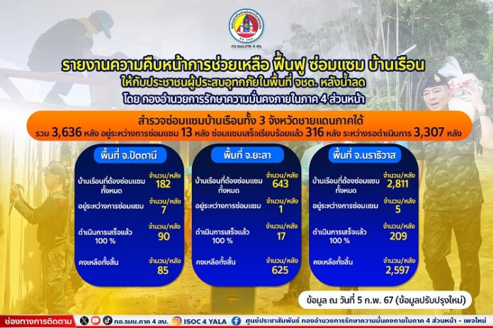 จากสถานการณ์อุทกภัยในพื้นที่จังหวัดชายแดนภาคใต้ ทั้งจังหวัดปัตตานี ยะลา นราธิวาส และบางส่วนของจังหวัดสงขลา ที่เกิดขึ้นเมื่อวันที่ 22 – 26 ธันวาคม 2566 ที่ผ่านมา กองอำนวยการรักษาความมั่นคงภายในภาค 4 ส่วนหน้า โดย พลโท ศานติ ศกุนตนาค แม่ทัพภาคที่ 4 / ผู้อำนวยการรักษาความมั่นคงภายในภาค 4 ได้บูรณาการกับหคน่วยงานในพื้นที่เข้าดำเนินการช่วยเหลือ ฟื้นฟู ซ่อมแซมบ้านเรือนให้แก่ประชาชนผู้ได้รับผลกระทบโดยทันที