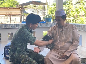 ทั้งนี้ สิบเอก อลิฟ เดง เป็นกำลังพลของหน่วยที่ได้ปลดพิการทุพพลภาพจากการปฏิบัติหน้าที่ราชการสนาม และได้รับบาดเจ็บจากการปะทะกระสุนเข้าบริเวณหัวไหล่ หน้าท้อง และโดนกระดูกไหปลาร้าหัก เหตุเกิดเมื่อวันที่ 15 กันยายน 2552 โดยหน่วยได้ดำเนินการเรื่องสิทธิกำลังพลอย่างครบถ้วน มีการบรรจุทายาททดแทน พร้อมทั้งเบิกทุนการศึกษาทหารบก ให้บุตรเรียนได้ถึงระดับปริญญาตรี และติดตามให้การช่วยเหลืออย่างต่อเนื่อง ทั้งนี้หน่วยได้มีนายสิบพยาบาลพูดคุยสอบถามถึงสุขภาพและโรคประจำตัว วัดความดันให้กับกำลังพลและครอบครัวอยู่ในเกณฑ์ปกติ หน่วยได้มอบของอุปโภค บริโภค ของใช้เด็กให้กับบุตรที่เพิ่งคลอดของกำลังพลที่ปลดพิการทุพพลภาพ ณ บ้านเลขที่ 136 หมู่ที่ 5 ตำบลลางา อำเภอมายอ จังหวัดปัตตานี