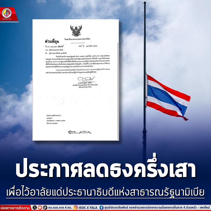 นายกรัฐมนตรี จึงได้มีคําสั่งให้ส่วนราชการและรัฐวิสาหกิจลดธงครึ่งเสาทั่วราชอาณาจักร เพื่อไว้อาลัยแด่ นายฮาเก กอตต์ฟรีด เกนโกบ ต้ังแต่วันที่ 7 – 9 กุมภาพันธ์ 2567 รวม 3 วันทําการ และขอความร่วมมือให้หน่วยงานของรัฐทุกแห่งลดธงครึ่งเสาตามกำหนด วันดังกล่าว