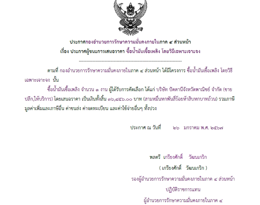 จัดซื้อ จัดจ้างประกาศผู้ชนะการเสนอราคา ประกาศผู้ชนะการเสนอราคา ซื้อน้ำมันเชื้อเพลิง โดยวิธีเฉพาะเจาะจง February 7, 2024 341 Share Facebook Twitter Google+ Telegram LINE