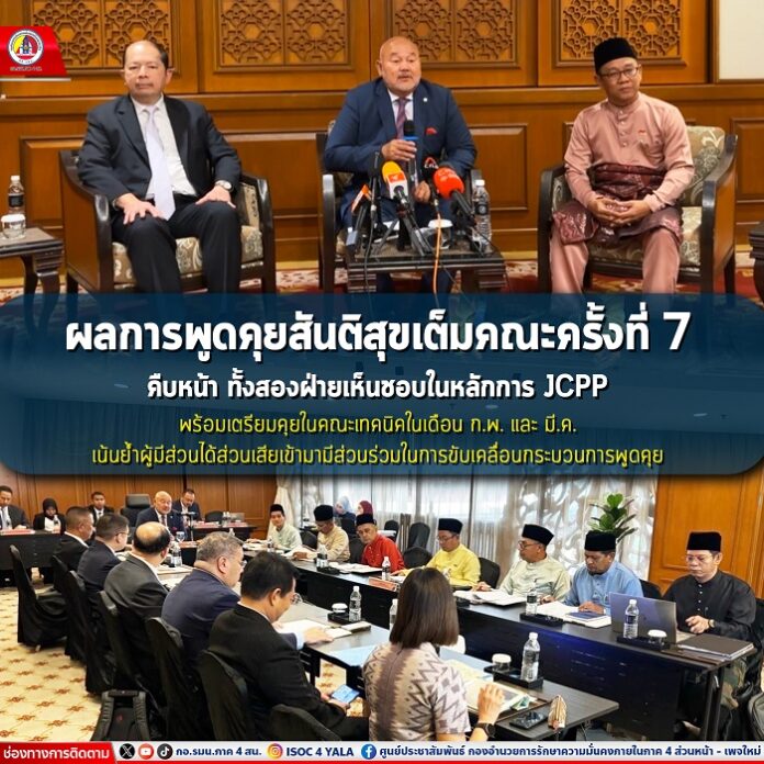 ในโอกาสนี้ ทั้งสองฝ่ายได้เห็นชอบในหลักการต่อแผนปฏิบัติการร่วมเพื่อสันติสุขแบบองค์รวม (Joint Comprehensive Plan Towards Peace – JCPP) ซึ่งจะมีการรับรองอย่างเป็นทางการในโอกาสแรกต่อไป ทั้งนี้ฝ่ายคณะพูดคุยฯ ยังได้แจ้งว่ามีความพร้อมในการดำเนินมาตรการสร้างสภาวะแวดล้อมกี้เกื้อหนุน ต่อการสร้างสันติสุข โดยจะมีการหารือมาตรการดังกล่าวร่วมกันในรายละเอียด โดยคณะทำงานเทคนิคของทั้งสองฝ่ายในห้วงเดือนกุมภาพันธ์และมีนาคม 2567