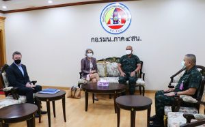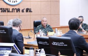 โดย พลโทเกรียงไกร ศรีรักษ์ แม่ทัพภาคที่ 4 / ผู้อำนวยการรักษาความมั่นคงภายในภาค 4 กล่าวว่า “วันนี้รู้สึกยินดีเป็นอย่างยิ่งที่ผู้แทนเลขาธิการ สหประชาชาติประจำประเทศไทย ผู้แทนสำนักงานป้องกันยาเสพติด และปราบปรามอาชญากรรมข้ามชาติแห่งสหประชาชาติ (UNODC) และผู้แทนสภาความมั่นคงแห่งชาติ ที่ได้เดินทางมาพบปะร่วมหารือในวันนี้ ถือเป็นโอกาสดีที่จะได้รับทราบการดำเนินงานของกองอำนวยรักษาความมั่นคงภายในภาค 4 ส่วนหน้า ในด้านการป้องกันแก้ไขปัญหายาเสพติด และปัญหาภัยความมั่นคงอื่น ๆ ซึ่งนับเป็นปัญหาด้านอาชญากรรมข้ามชาติ แต่สำหรับปัญหาอาชญากรรมข้ามชาติในพื้นที่จังหวัดชายแดนภาคใต้นั้น ในช่วงปีที่ผ่านมาภาพรวมมีสถิติลดลงเนื่องจากมีสถานการณ์การแพร่ระบาดของไวรัส covid-19 ทำให้การเดินทางผ่านช่องทางเข้าออกแนวชายแดนประเทศไทยมาเลเซียทำได้ยากขึ้นเพราะมีกำลังเจ้าหน้าที่ชุดป้องกันชายแดน ทั้งฝั่งไทยและมาเลเซีย บูรณาการร่วมกับส่วนที่เกี่ยวข้องคุมเข้มพื้นที่เข้าออกตลอดแนวชายแดนทุกช่องทาง ถือเป็นการจำกัดเสรีในการปฏิบัติของอาชญากร ไม่ว่าจะเป็นเรื่องของปัญหายาเสพติดหรือเครือข่ายแรงงานต่างด้าว สินค้าผิดกฎหมายแม้กระทั่งกลุ่มผู้ก่อเหตุรุนแรงในพื้นที่ ส่วนด้านสถานการณ์ยาเสพติดในพื้นที่จังหวัดชายแดนภาคใต้นั้น เจ้าหน้าที่กำลังทั้ง 3 ฝ่าย ได้มีการบูรณาการร่วม จับกุมผู้ค้ายาเสพติดรายใหญ่ได้อย่างต่อเนื่อง ทำให้เครือข่ายของขบวนการค้ายาเสพติดลดลง เนื่องจากนโยบายการแก้ไขปัญหายาเสพติดในพื้นที่ ที่ดำเนินการตามยุทธศาสตร์การป้องกันและแก้ไขปัญหายาเสพติด มาเป็นกลไกหลักในการดำเนินการ สร้างเครือข่ายพลังภาคประชาชนเพื่อให้เป็นพลังมวลชนภาครัฐ ในการร่วมแก้ไขปัญหายาเสพติด สร้างชุมชนที่เข้มแข็ง ขับเคลื่อนกิจกรรมผ่านสภาสันติสุขตำบล ป้องกันและปราบปรามยาเสพติด ตลอดจนกระบวนการบำบัดฟื้นฟู และการพัฒนาคุณภาพชีวิต ของผู้ที่ได้รับผลกระทบ ทำให้คุณภาพชีวิตดีขึ้น สถิติการกลับมาของผู้ค้าและเสพจึงลดลงโดยลำดับ”