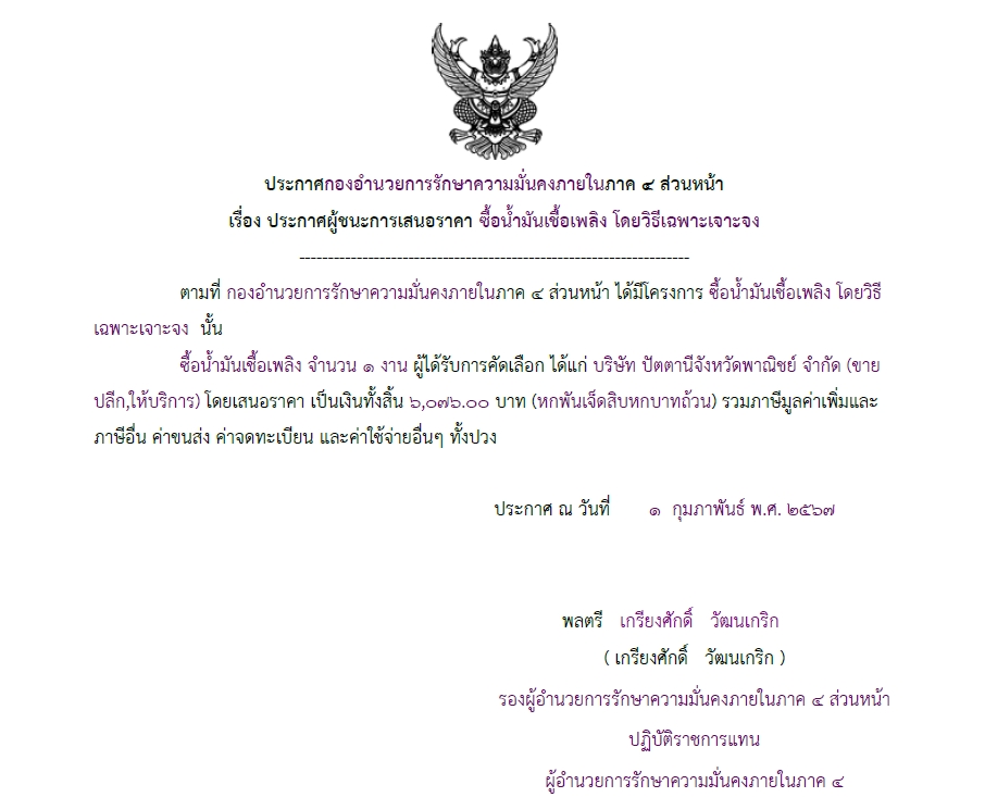 ประกาศผู้ชนะการเสนอราคา ซื้อน้ำมันเชื้อเพลิง โดยวิธีเฉพาะเจาะจง