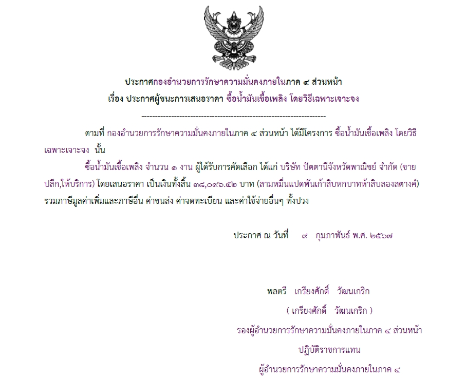 ประกาศผู้ชนะการเสนอราคา ซื้อน้ำมันเชื้อเพลิง โดยวิธีเฉพาะเจาะจง