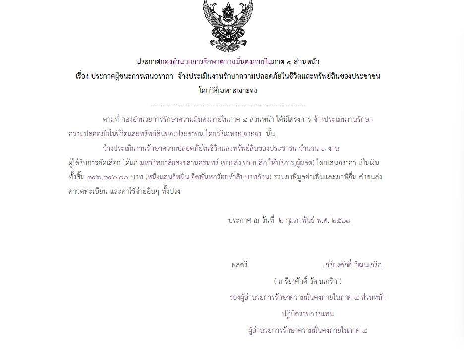 ประกาศผู้ชนะการเสนอราคา จ้างประเมินงานรักษาความปลอดภัยในชีวิตและทรัพย์สินของประชาชน โดยวิธีเฉพาะเจาะจง