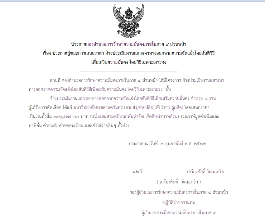 จัดซื้อ จัดจ้างประกาศผู้ชนะการเสนอราคา ประกาศผู้ชนะการเสนอราคา จ้างประเมินงานแสวงหาทางออกจากความขัดแย้งโดยสันติวิธีเพื่อเสริมความมั่นคง โดยวิธีเฉพาะเจาะจง February 15, 2024 373 Share Facebook Twitter Google+ Telegram LINE
