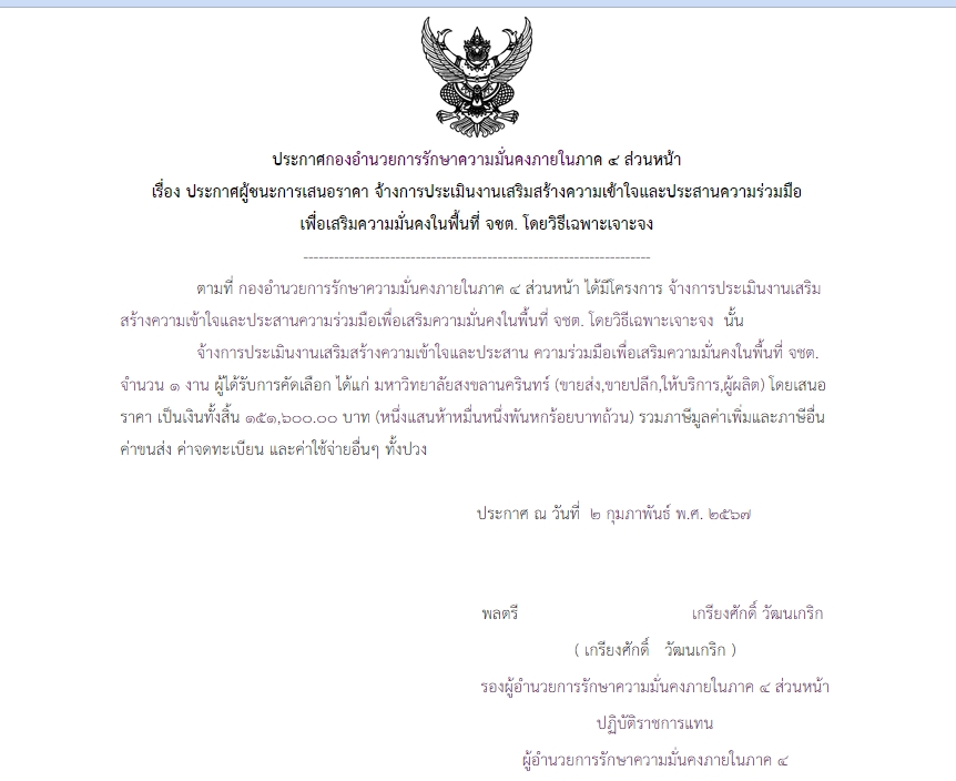 จัดซื้อ จัดจ้างประกาศผู้ชนะการเสนอราคา ประกาศผู้ชนะการเสนอราคา จ้างประเมินงานเสริมสร้างความเข้าใจและประสารความร่วมมือเพื่อเสริมความมั่นคงในพื้นที่ จชต. โดยวิธีเฉพาะเจาะจง February 15, 2024 342 Share Facebook Twitter Google+ Telegram LINE
